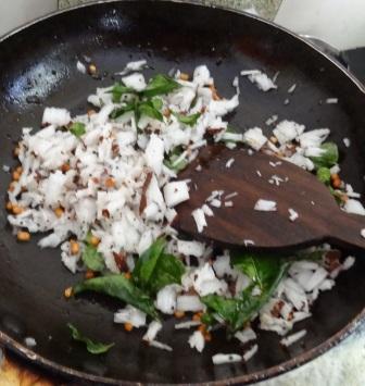 Prepare the tempering by allowing the mustard & urad dal to crackle in the hot oil. Add curry leaves and as it wilts , tip in the grated /finely sliced coconut. Saute till it turns golden n crispy. I prefer the coconuts to be very finely sliced for the tempering as it gives an extra crunch !