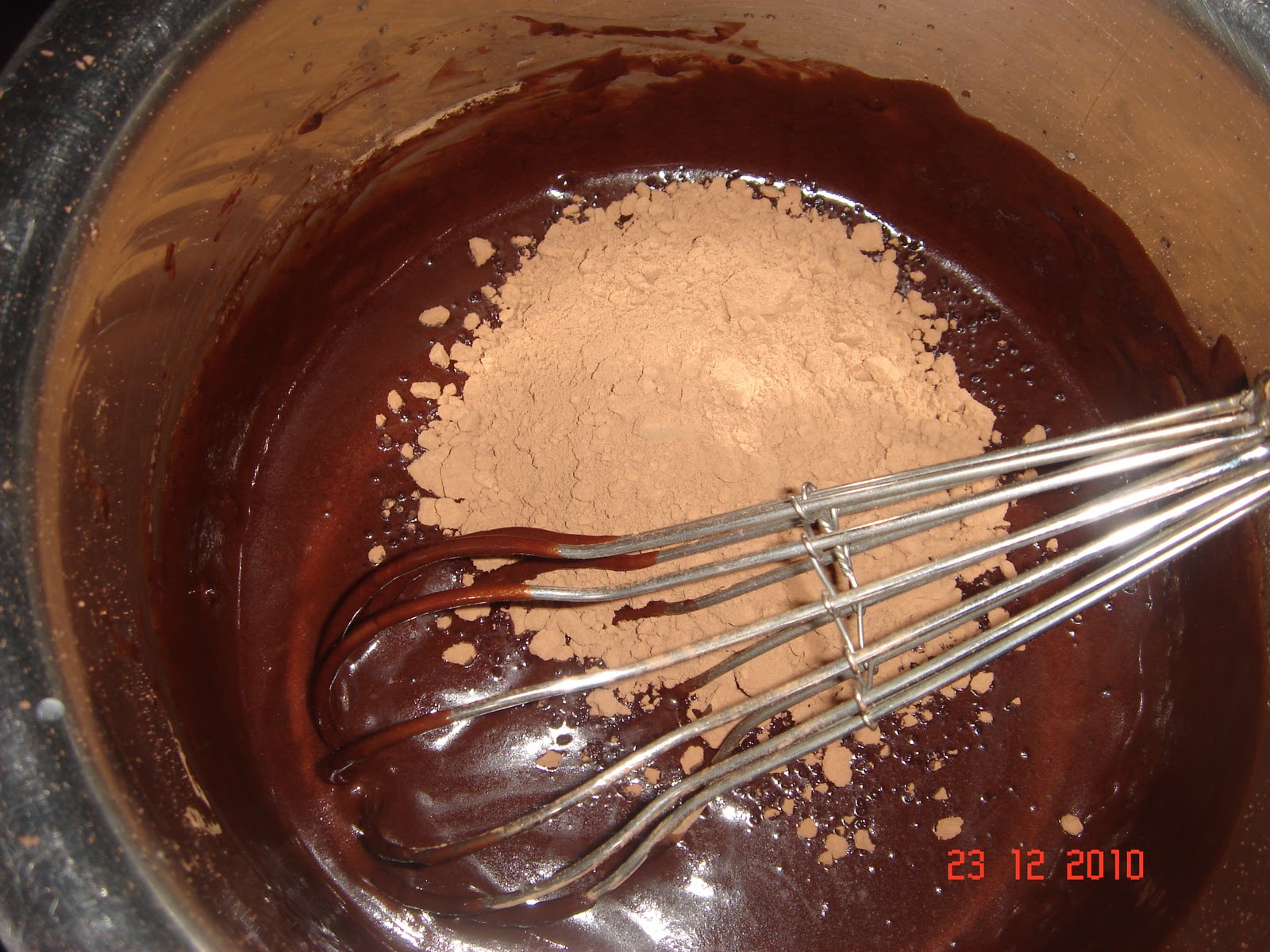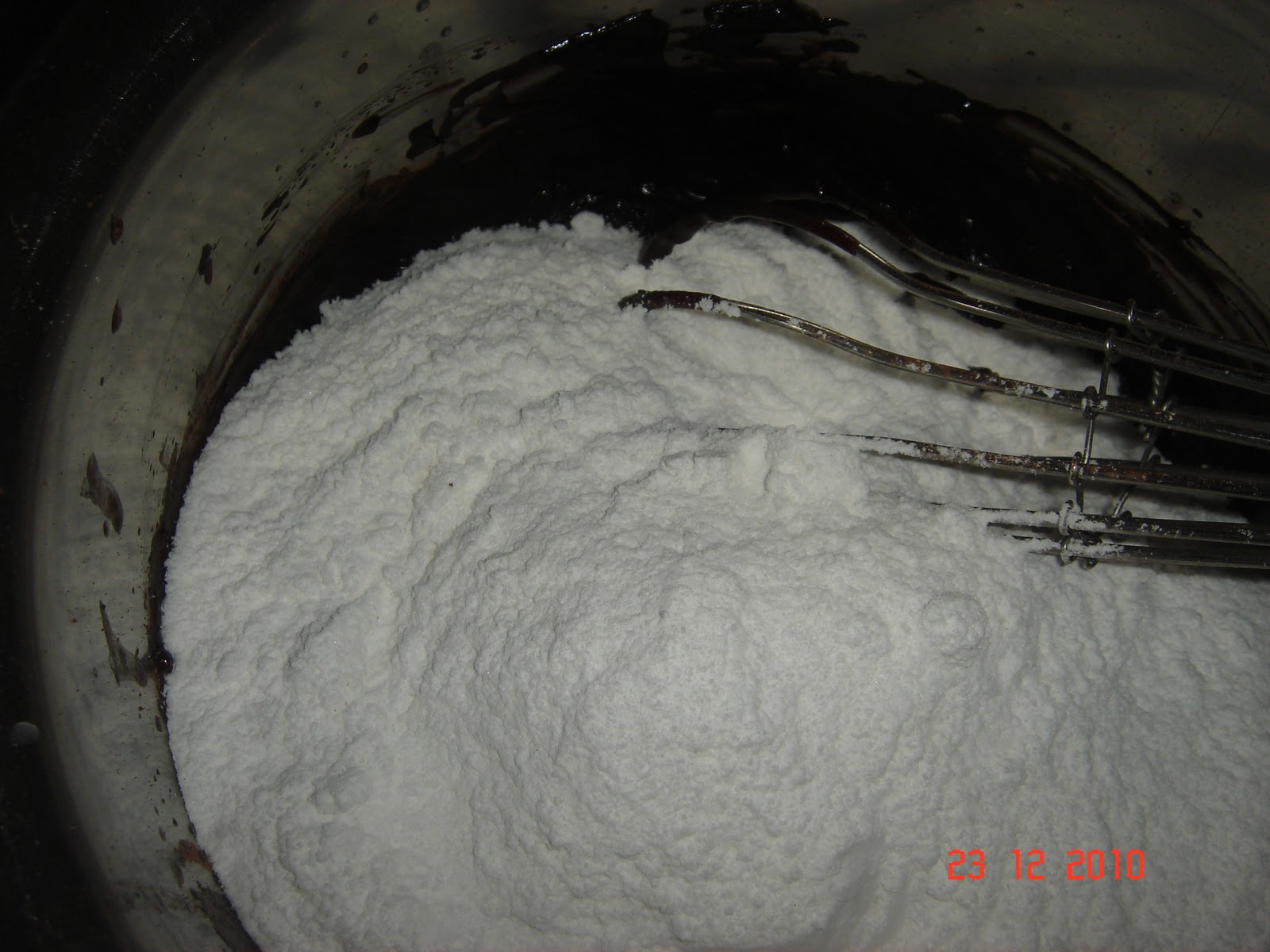 In separate bowl, sift flour and baking powder together, then fold the flour to the cocoa mixture.  I whisked again for 5-10 minutes