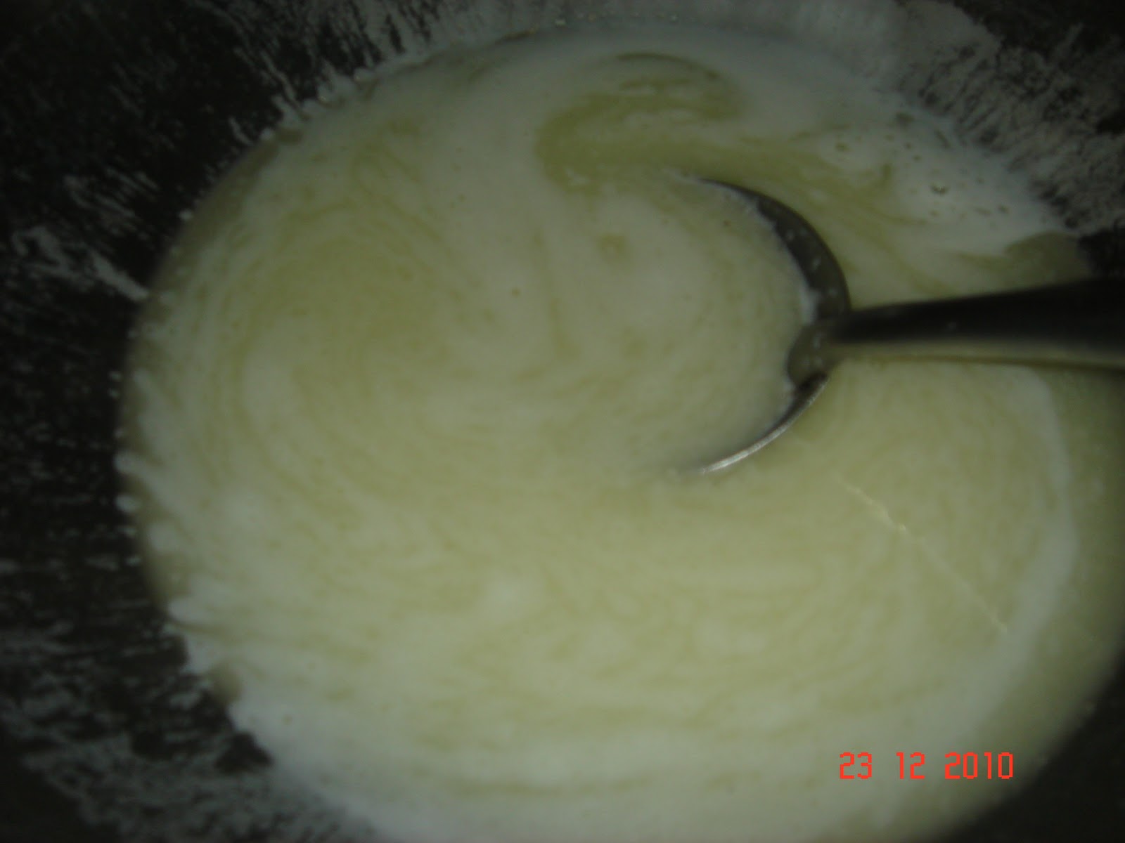 Whisk in the eggs (one at a time preferably) . It was very labour intensive and i went whisk, whisk, whisk for almost 15 minutes !
