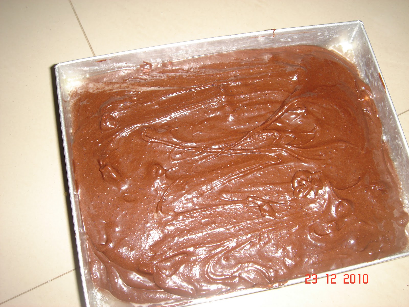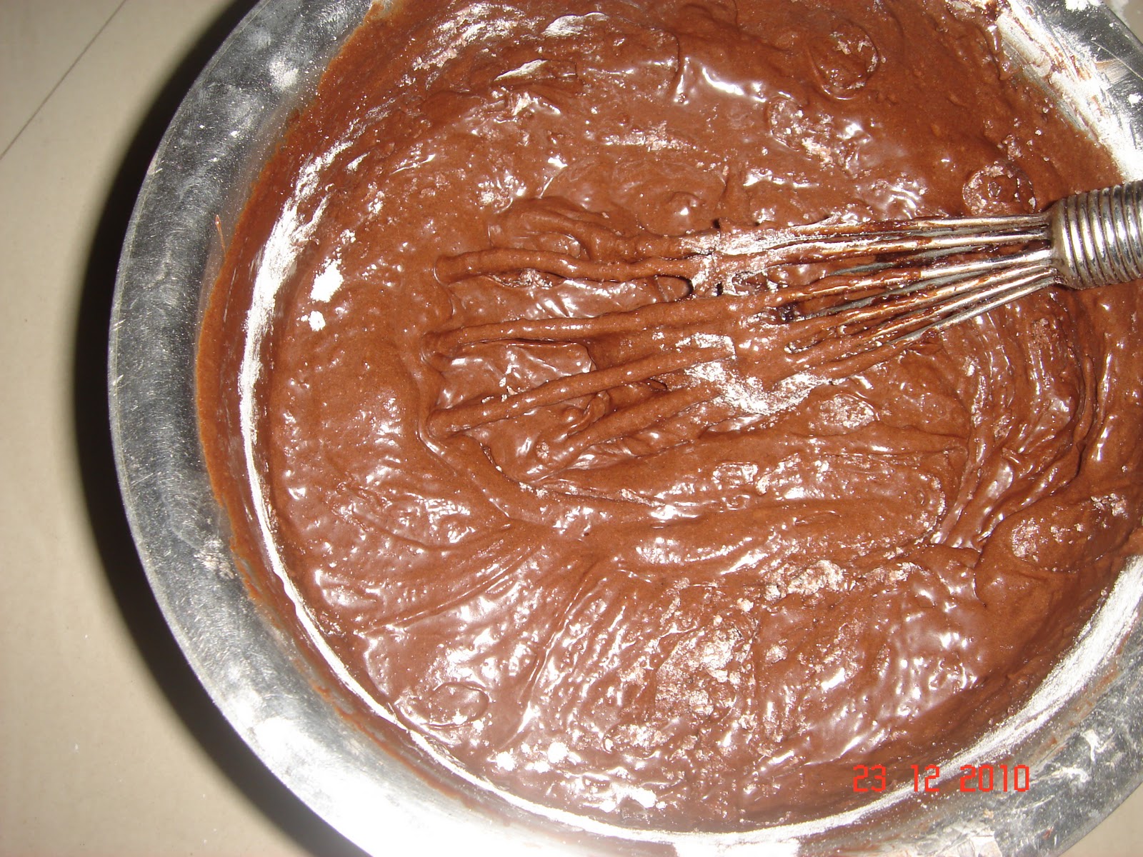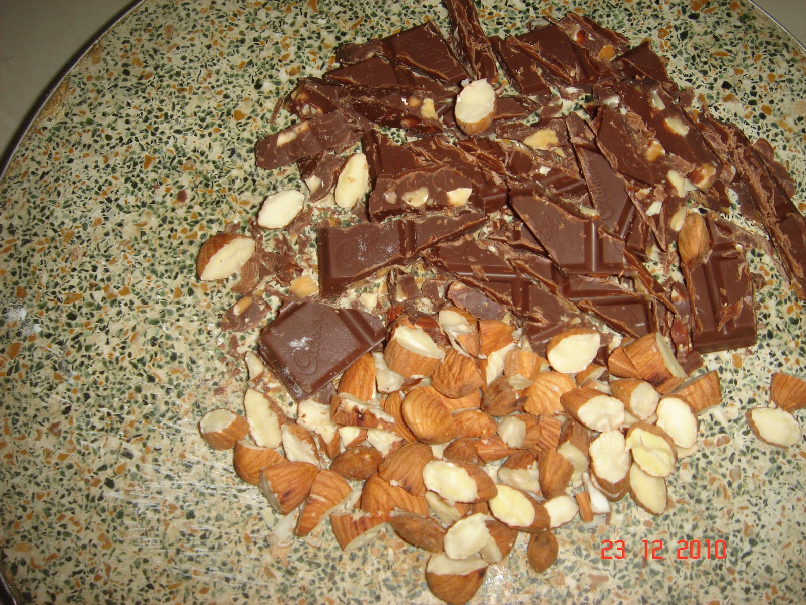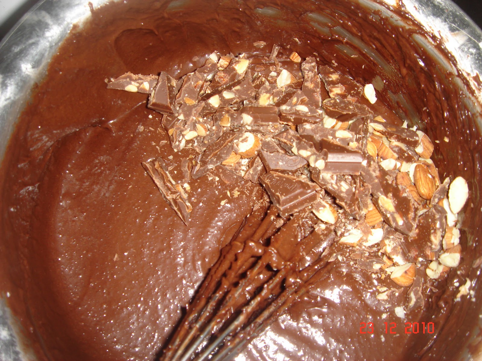 I had a pack of  Almond Treats–Cabury Temptations in my Fridge. I used approximately 125 gms along with the roasted n chopped almonds. Fold them through the batter. And again go whisking!!