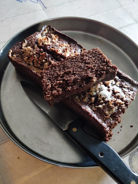 - Preheat oven to 160° C. Grease a loaf pan and line it with parchment paper (if you have). Whisk flour, cocoa powder, salt, and baking powder in a bowl and set aside. Using an electric mixer on medium-high speed, beat oil,sugar until pale and fluffy. Add eggs one at a time, beating to blend between additions; beat until mixture is very light and doubled in volume. Add vanilla. Reduce mixer speed to low and add dry ingredients in 3 additions, alternating with buttermilk in 2 additions, beginning and ending with dry ingredients. Scrape batter into prepared pan and sprinkle with coconut. Take care not to overmix the batter !