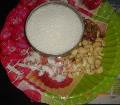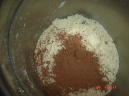 Grind together the roasted rice flakes, cashews, pistachios, sugar, cardamom and the coconut into a fine powder. Add cocoa powder and give it a quick pulse.