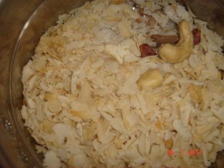 Dry roast rice flakes till golden brown. Care should be taken not to scorch/burn them !