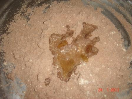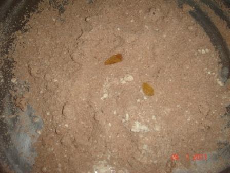 Heat the ghee and let it remain on low flame. On a lightly greased plate/tray spill the powdered contents and garnish them with raisins (u can also add sliced dessicated coconut or cashws) .