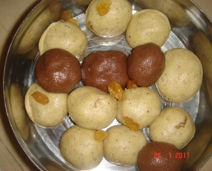Add hot ghee little by little as needed and shape it into laddoos. The hot liquid helps in shaping them; i have to say my rounds are not perfect but am getting there ! The quantity of ghee specified can be adjusted as needed.