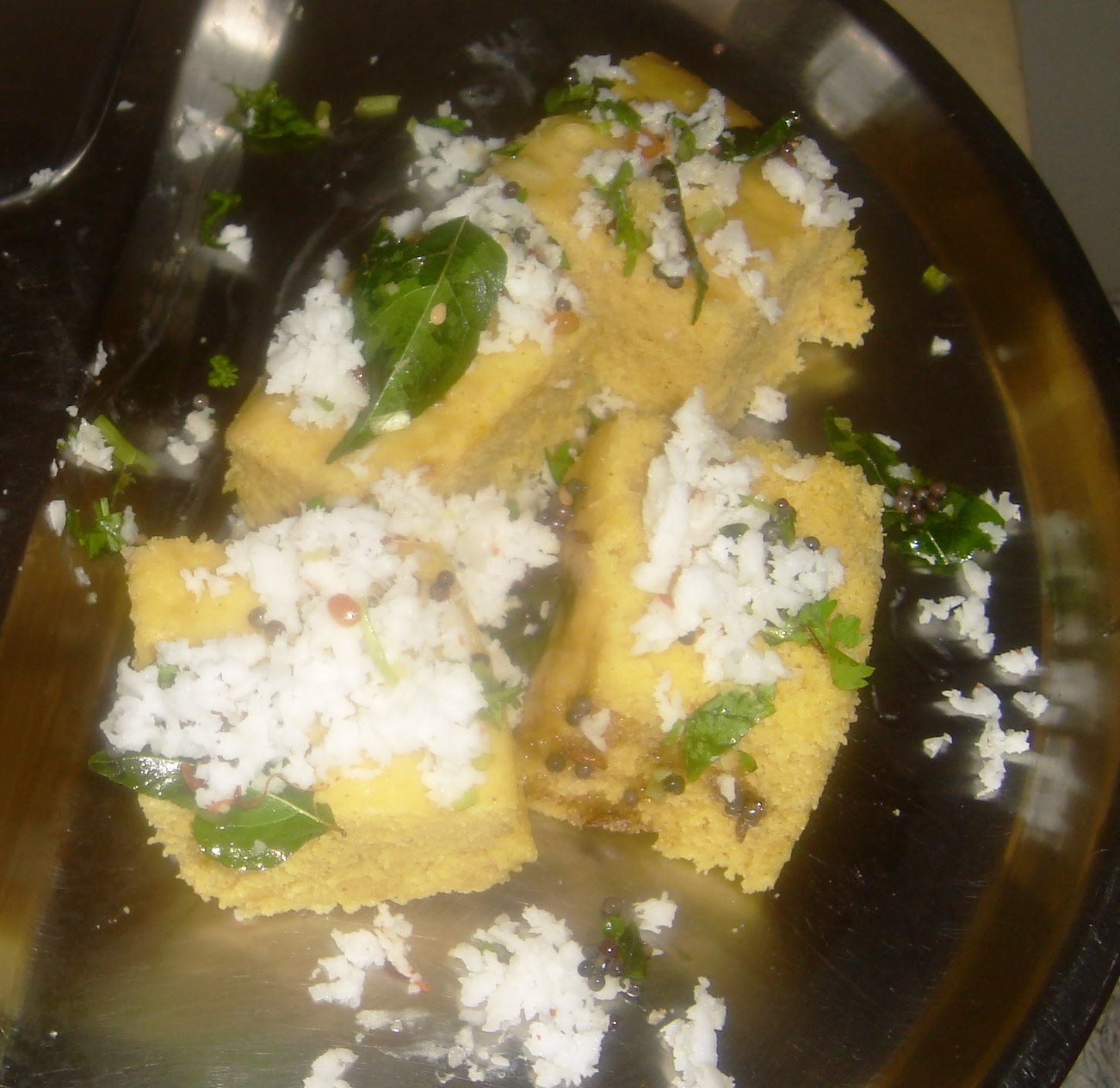 Allow the Dhoklas to steam for a good 10-12 minutes. After switching off the gas let it remain for 5 more minutes before you transfer the contents to a plate for cutting them in to cake/square like shapes.