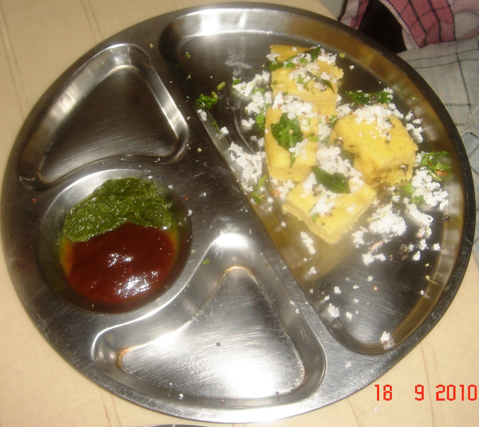 Dhokla is a fluffy Gujarati Delicacy made out of chickpea flour or besan. The batter made with the flour is then poured in to a greasy plate for steaming and cut as small pieces of cakes with suitable seasoning and garnishing. It is served with Mint Chutney, Date Tamarind Chutney (Khatta Meetha chutney) etc.