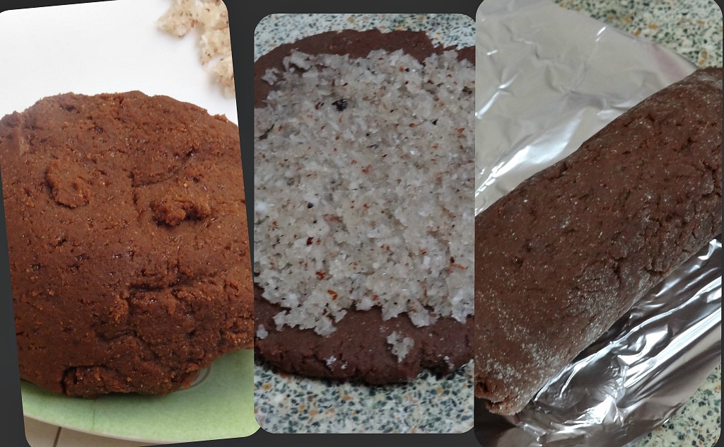 Now pinch a medium sized ball from the biscuit-cocoa dough and roll across thickly like you do for a flat bread/chapati. Spread the dry coconut mix all over evenly. Roll it to form a cylinderical shape and repeat the procedure for the rest of the dough. Wrap the cylinders separately in a cling wrap and refrigerate them for an hour.
