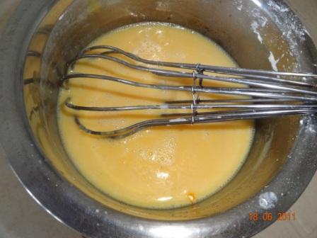 In the meanwhile heat the milk in a pan and stir in the sugar, after it melts completely set it aside and let it cool to room temperature. Now add the custard powder and whisk well. Tip in the butter and mix again.
