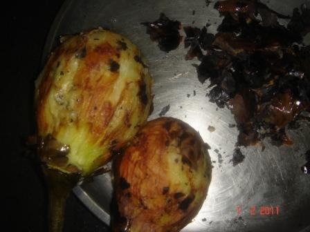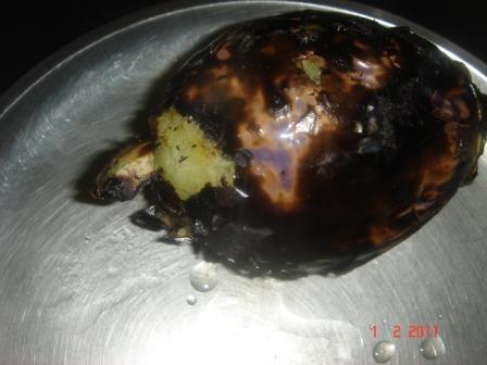 Turn it frequently until fully roasted. Put the smoky charred brinjal in cold water to cool and peel the skin.