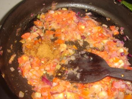 Add chopped tomatoes and let it cook for a while. Now add red chilli powder, turmeric powder, garam masala and salt and let it cook till the flavours blend !.