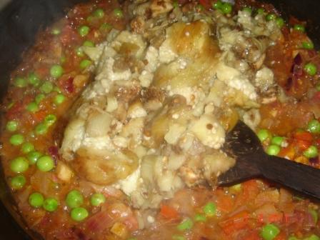 Add green peas and cook till it becomes tender. Now add the mashed brinjal flesh and mix well. Let it cook over medium heat for some time.