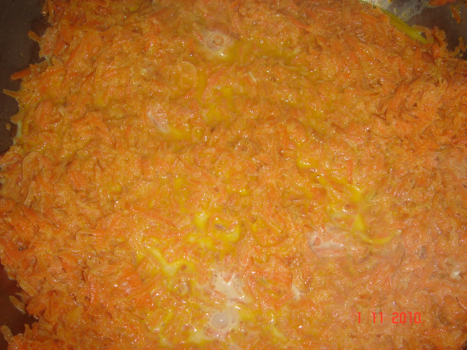 In a kadai or thick bottomed pan, heat 4-5 tsp of ghee and saute the grated carrots for a few minutes. Now add the milk and the milk maid and cook the carrots till they are well cooked and the milk evaporates.