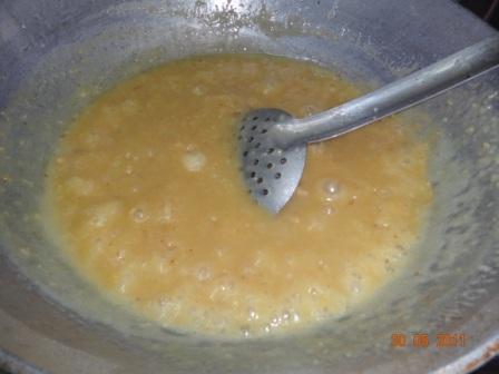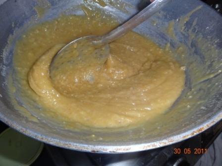 A few more minutes  and the mix thickens/comes together and is ready to be dunked in to the greased plate.