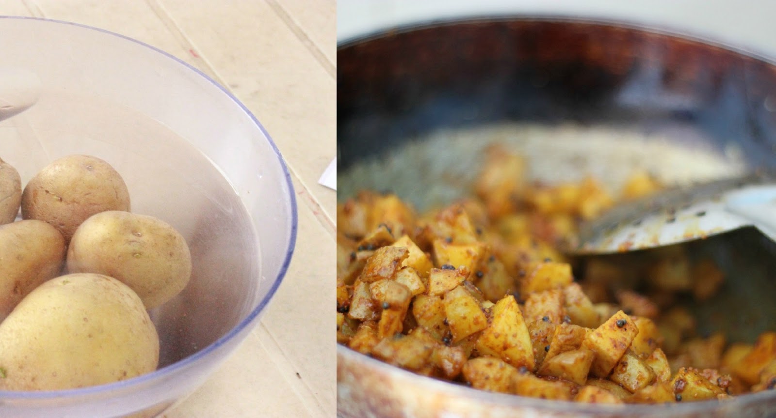 Mix the tamarind paste in hot water. Add palm sugar to it and set aside.Cube the potatoes. Heat the oil in a pan/wok and let the mustard seeds crackle. Tip in the cubed potatoes and fry for a few minutes stirring.