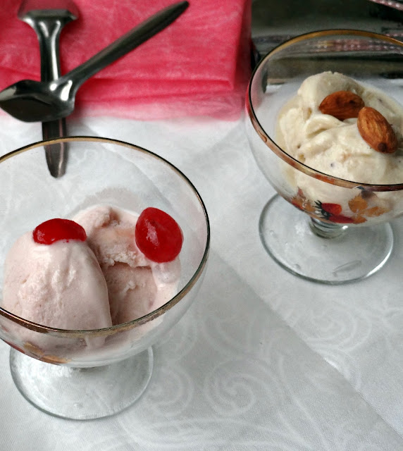 It’s been a while, my refrigerator saw some ice-cream action what with kids falling sick and when hubby dearest was itching to tickle his taste-buds,the strawberries & bananas beckoned me and I went ahead and made 2 separate batches of ice-creams ; While bananas made a happy pair with roasted almonds, strawberries gelled well with the creamy mix for another batch.