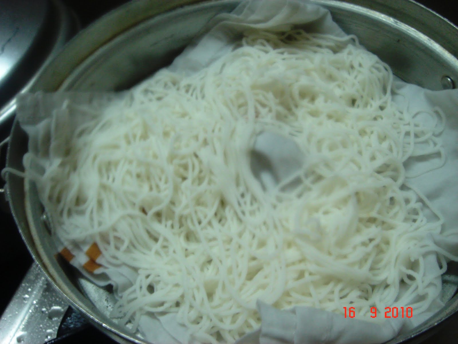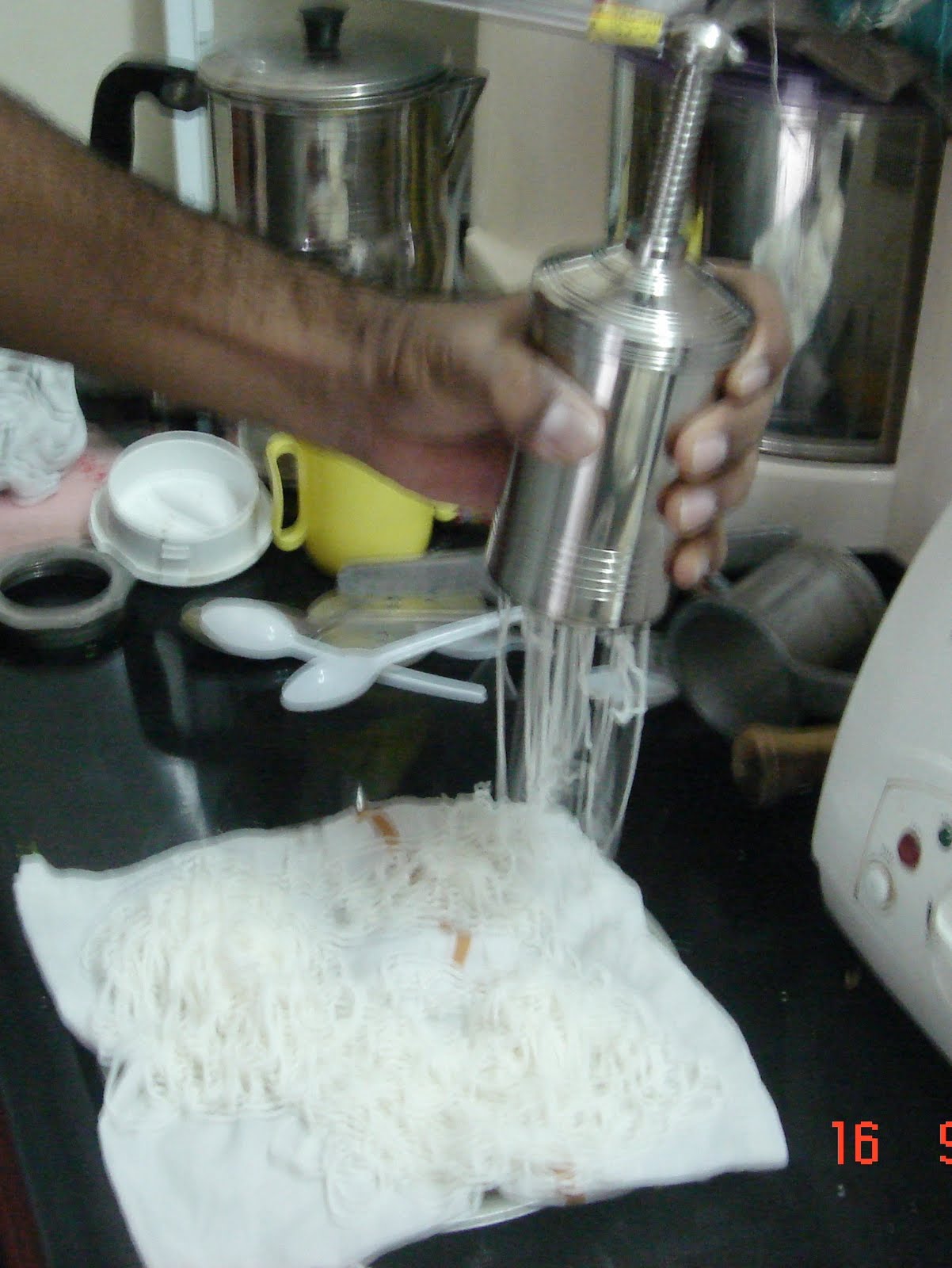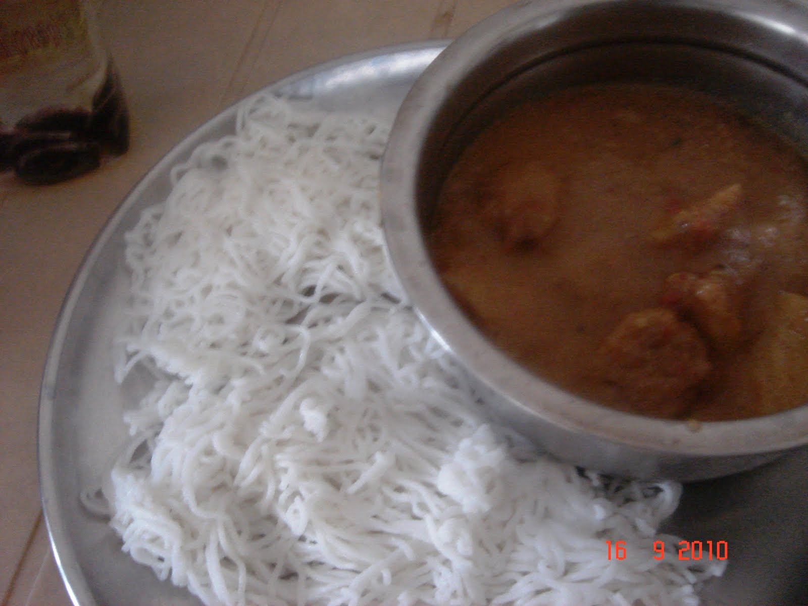 This is my first attempt at making these string hoppers. Though i have relished this dish many a times at restaurants and wedding celebrations, I have never made them at home. I had already prepared dum alu for breakfast. So for the curry to be served with string hoppers, I diluted the gravy a little bit by adding coconut milk and making it more watery.