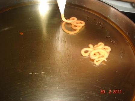 Now fill the pouch with the batter, hold and press the cone/pouch and draw jangris by making a circle and swirling small coil type rings around it.
