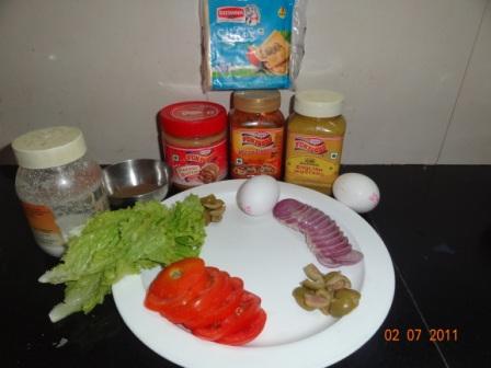 Gently break the egg in to a hot pan and let it cook. Top it up with pepper powder. Set it aside. Lather mayonnaise, peanut butter & pizza sauce on three bread slices. Pile up onions, tomatoes and lettuce along with few olive pieces on peanut buttered bread.