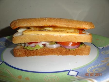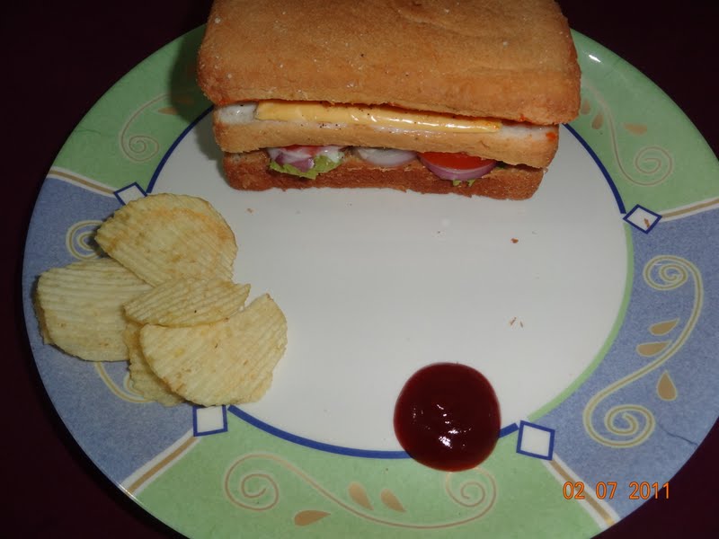 Saturday nights are generally sombre- hubby dearest is usually @ work and not expected till 11 pm. That means my kids n me are happy with maggi noodles that have seem to become the saturday night (*). Yesterday was different- hubby had taken the evening off and we decided to spend the night watching TV and junking on titbits. Nothing on the Idiot Box excited us except the Wimbledon. The News channel came to the rescue with all n sundry interesting happenings – from the review of friday flicks (Delhi Belly looks engaging) and the verdict on Neeraj Grover murder to the wealth amassed in the Tiruvanandhapuram Temple, the updates had us hooked. It was also a happy snacking time with hubby making a huge sandwich piled with veggies, cheese & eggs. I call it the jumbo quickwich (it was a quick assembling of ingredients). The best part was that he not only chopped, diced n sliced but he also took clicks as he assembled the quickwich. The sandwich got a huge =D> from kids and me and Hubby wore a happy :> look !