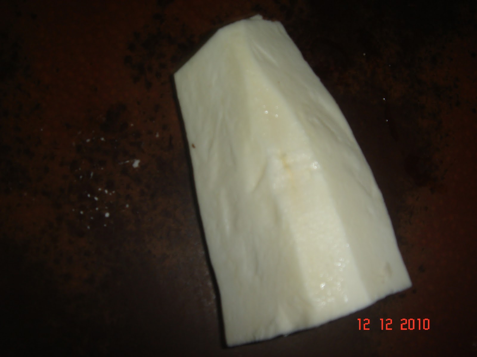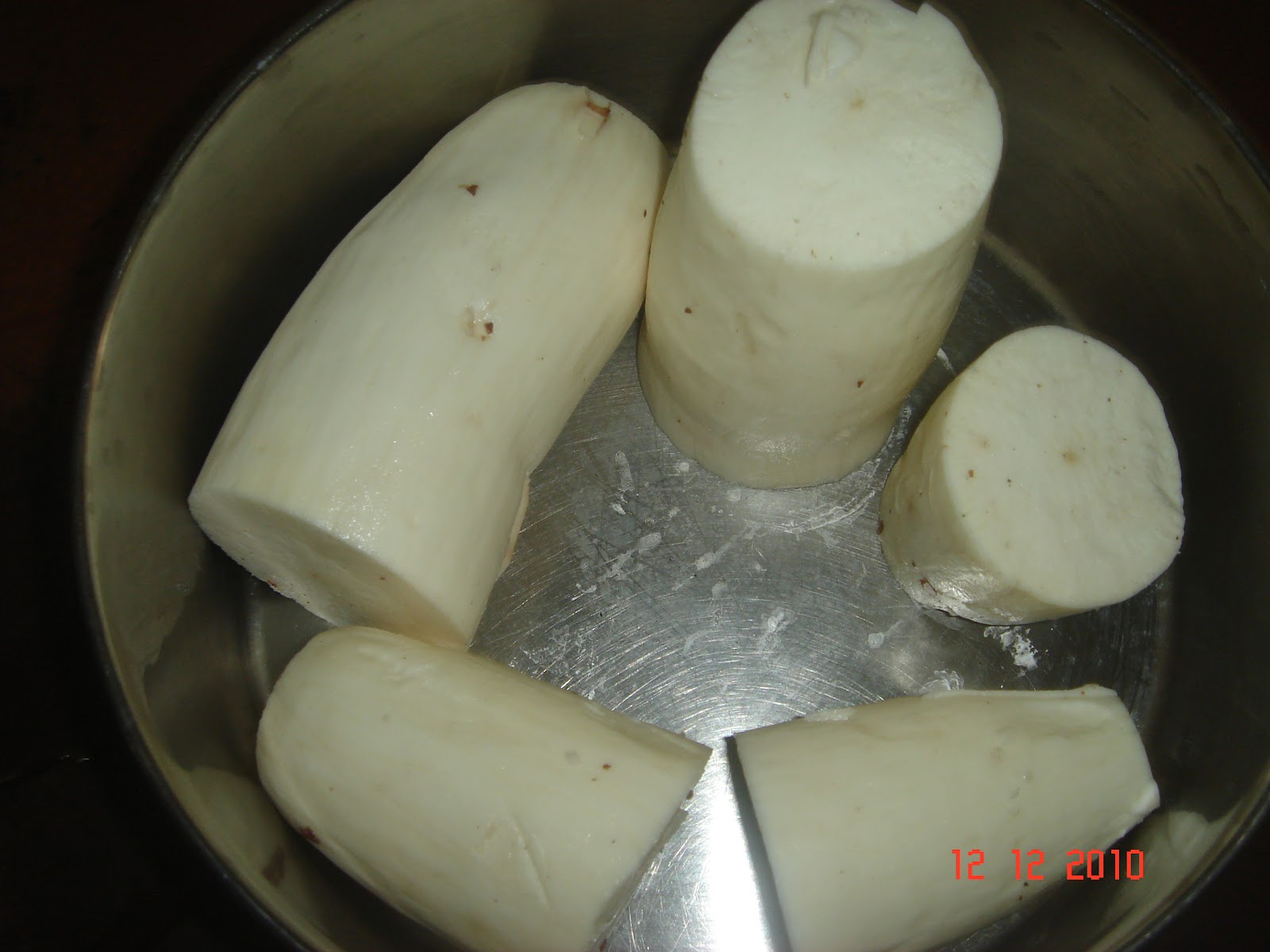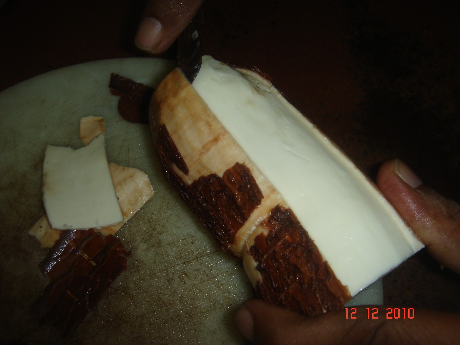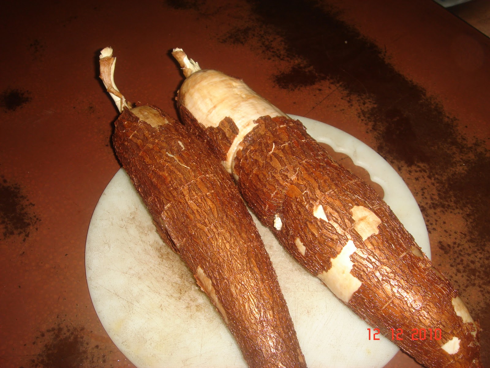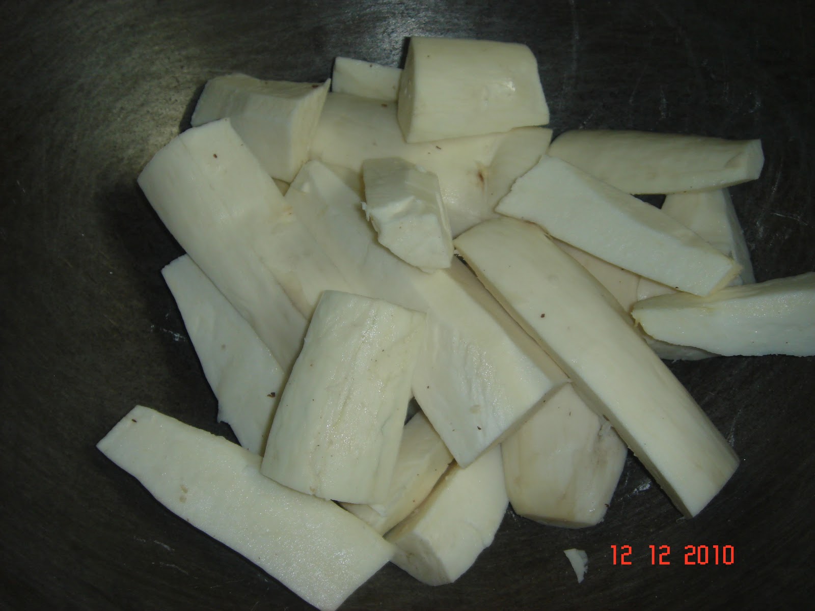 The Tapioca Tuber looks like this . Cleaning and chopping it in to small chunks is a process in itself–