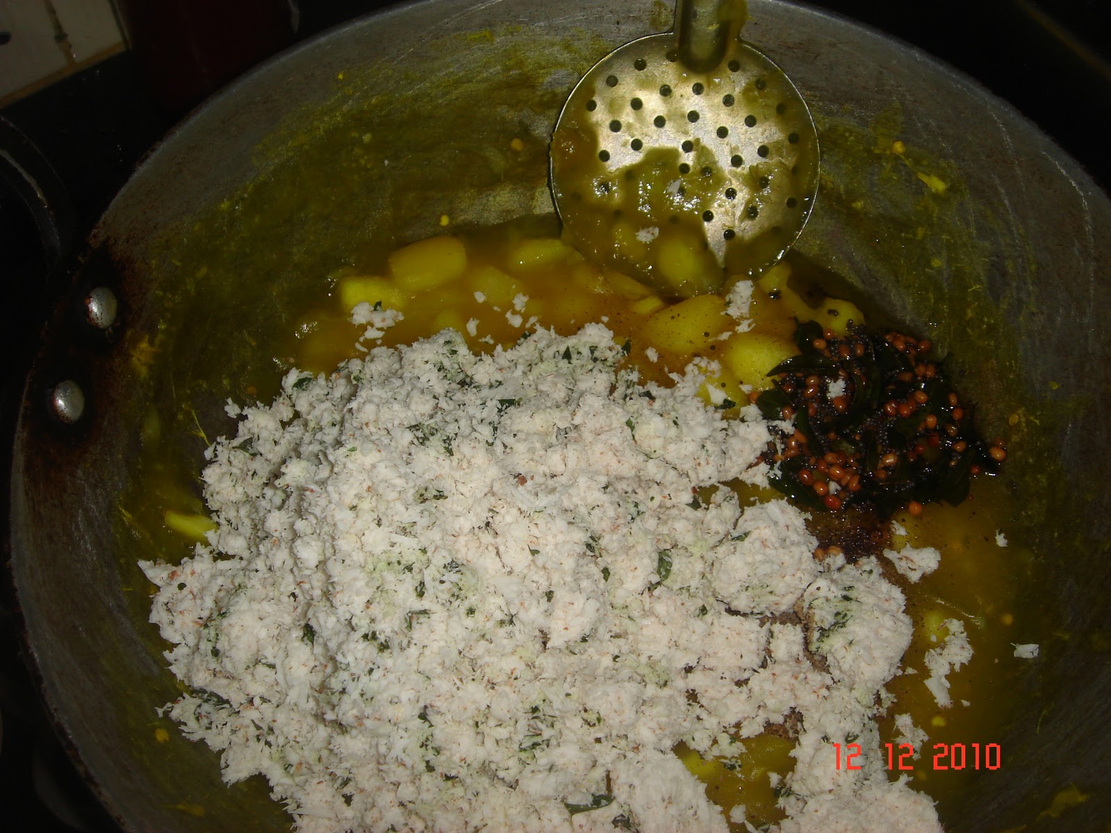 Add the coarse coconut powder, tempering to the cooked tubers and mix well. Let the mixed curry simmer for a while . To give it a more authentic taste add little coconut oil to this curry. Mix well and serve hot !