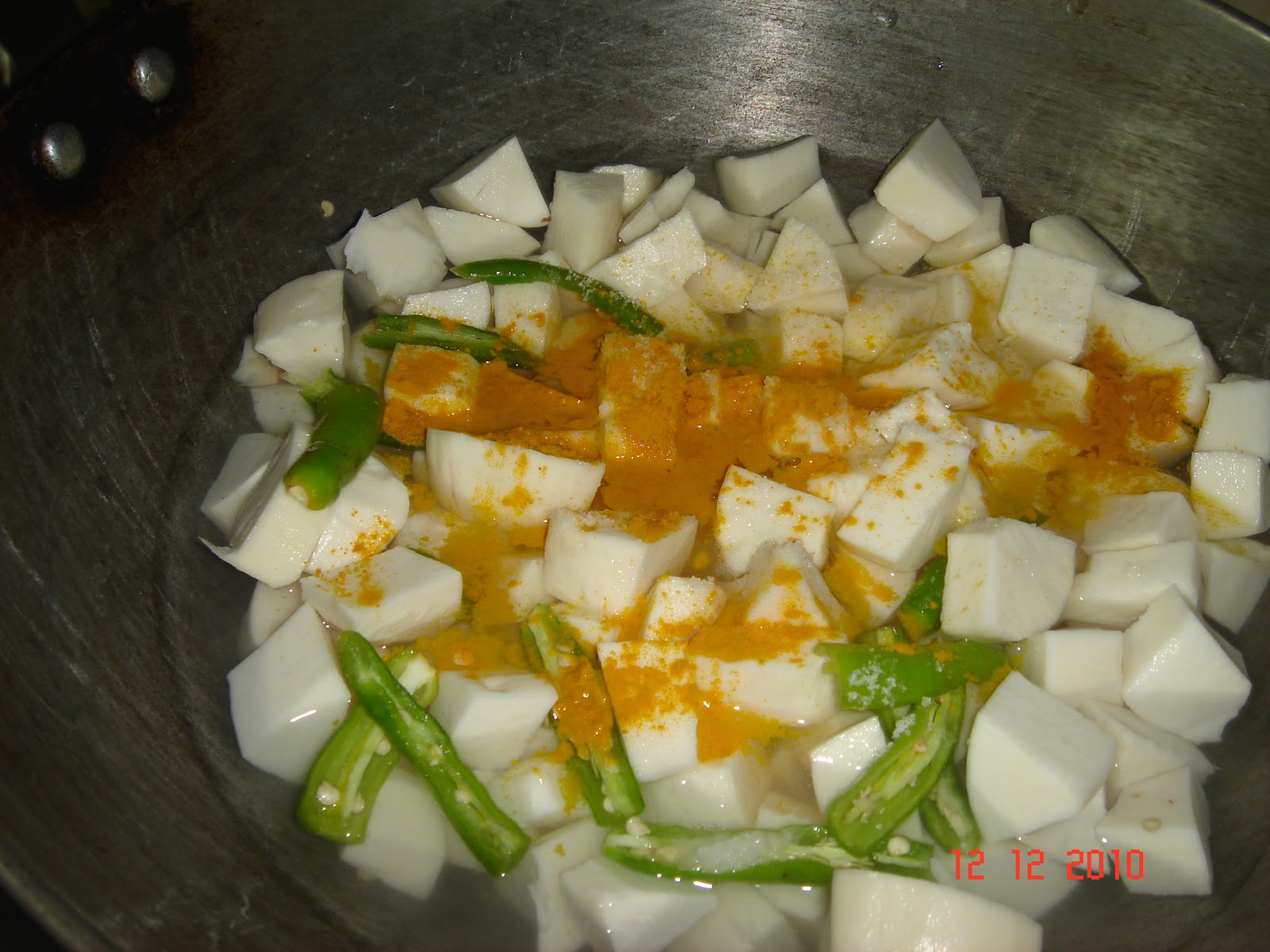 Wash the chopped pieces well and in a heavy bottomed pan add enough water along with 2-3 slit green chillis and turmeric powder and cook till it is soft and tender.