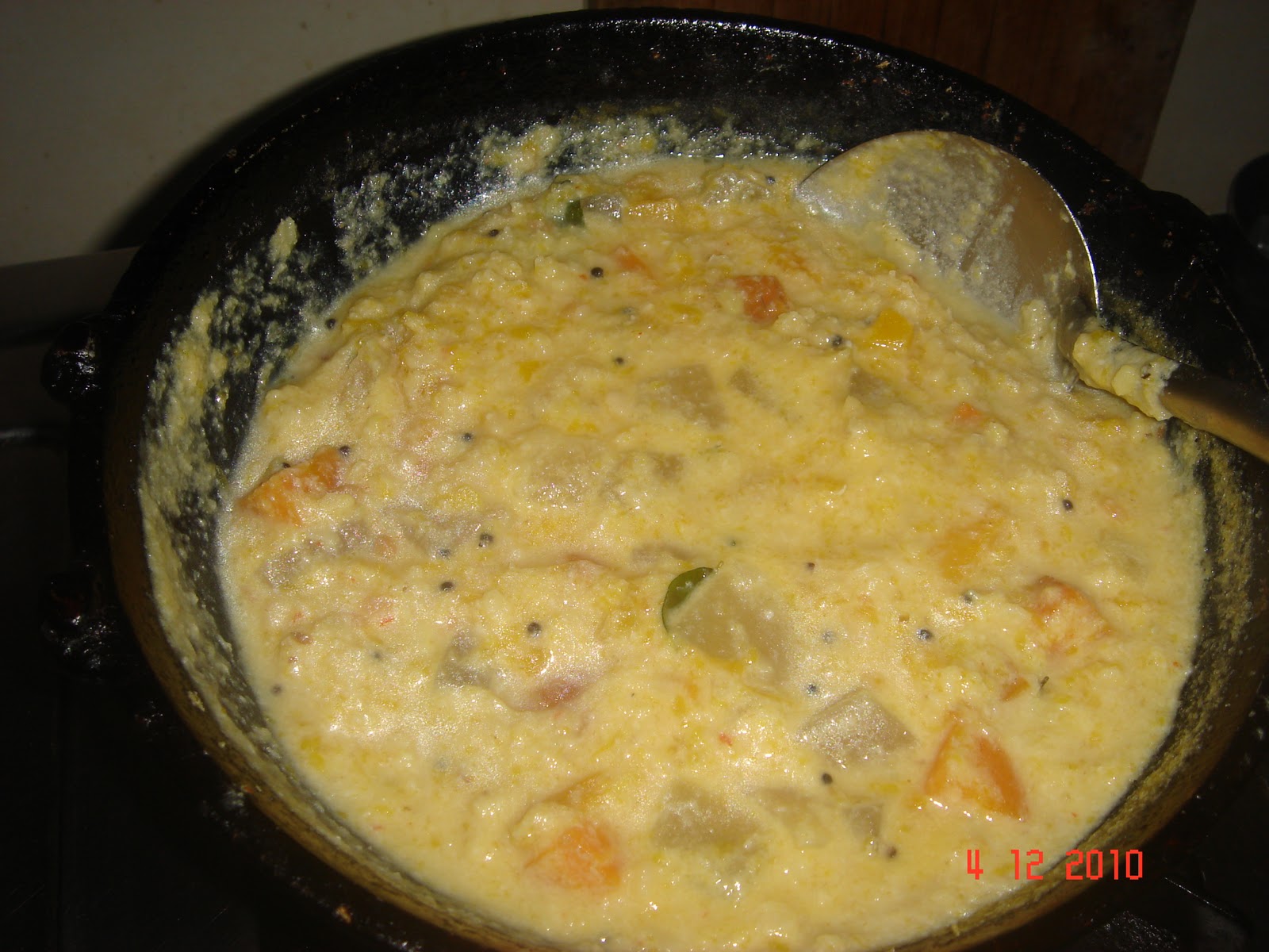 Molagootal is to Palaghat Iyers what Kootu is to Tamilians. This is a mix of vegetables or spinach along with lentils and fresh coconut. The combination of Vegetables can be cabbage ,carrot n peas or White n Yellow Pumpkin or Yam n Koorkai (Chinese potato ) — the list can be endless. It’s a very healthy with a delicious blend of flavours and is had with hot steaming rice. The typical accompaniments to a meal of this curry and rice is Mangai Chammandi (Raw Mango Chutney), Puli inji (Tamarind-Ginger concoction) or any pickle.