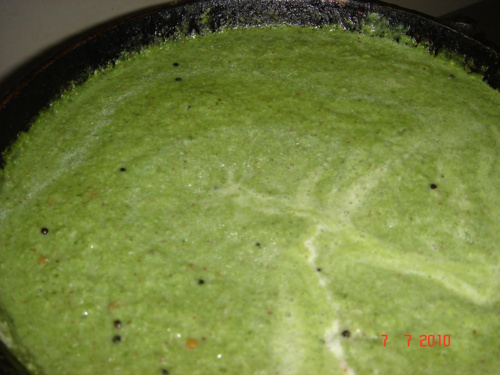 NOw for the final mix—- In a wok add some oil (coconut oil for the heady fragrance) and allow mustard seeds and urad dal to splutter. Now add the finely ground spinach, moong dal and the cocnut paste and bring the mix to a simmer.