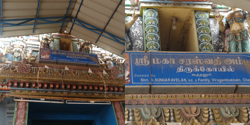 According to the history, King Rajaraja Chola donated this temple to Ottakoothar a renowned poet so that he could compose in peace. Hence this town came to be called as Koothanur = Koothan (the poet) + oor (village).