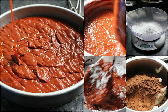 Place the butter, water and cocoa powder in a small saucepan and heat gently without boiling, stirring until melted and smooth. Remove from heat and leave to cool slightly.
