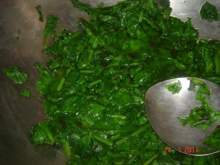 Wash spinach  well and cut into small pieces. Slightly cook with half a cup of water and a bit of salt over medium heat for a few minutes. Drain water- squeeze it completely and set aside.
