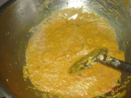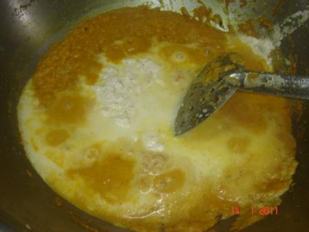 Now add the pureed tomatoes along with salt to taste and let it cook for a while.  Add the cashew- almond paste. Stir well and cook on low heat for seven to eight minutes.