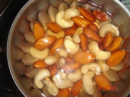 In the meanwhile soak the cashews and almonds in hot water and grind it in to a fine paste.