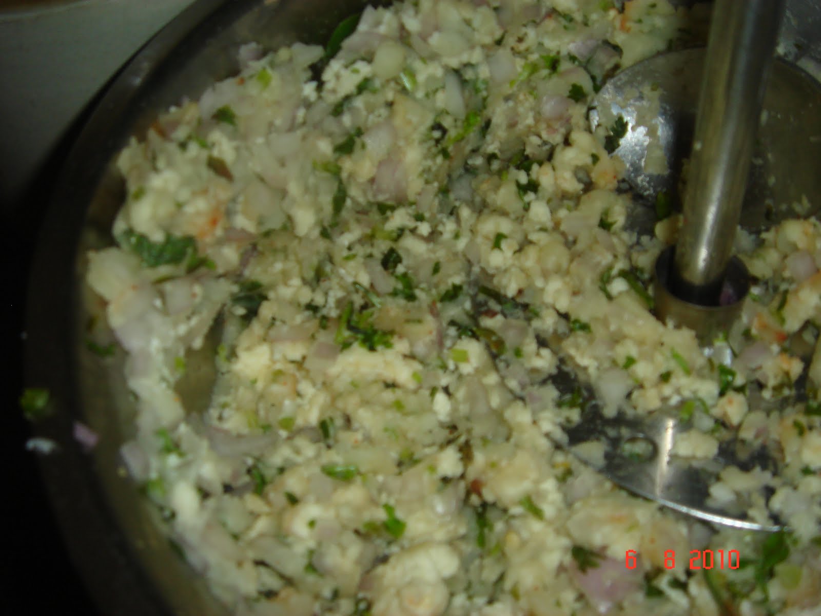 Procedure:- To prepare the stuffing, mix the finely chopped onions, green chillis and coriander leaves along with potatoes and the cottage cheese. Mash it well to avoid any lumps