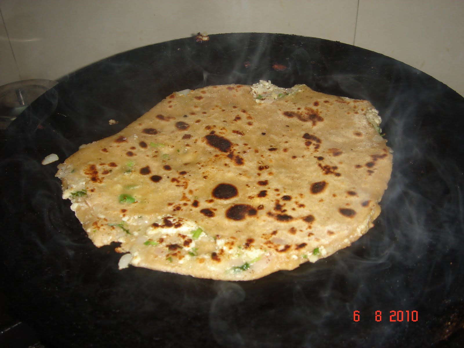 Ingredients:- Paneer(cottage cheese), Boiled Potatoes (1 or 2),Onions(finely chopped), Green Chillis and Coriander leaves (finely chopped), salt, red chilli powder (optional), WHeat flour for dough and little oil
