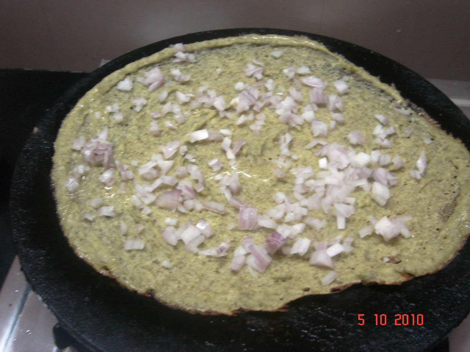 Soak the Green Gram Dal and Urad Dal for 4-6 hours. Now grind it along with Ginger and Green Chillis with water to a fine Dosa Batter Consistency.