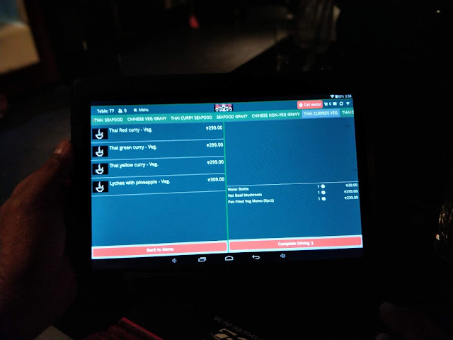 Loved the mix of Chinese & Thai  on the menu. The eclectic mix of dishes we ordered was delivered promptly by the machines. Especially lip smacking was the Hot Basil Mushroom & Thai Green Curry (Veg). The pan fried momos was rubbery and Khao Pad Namprik (Veg) could have been better.