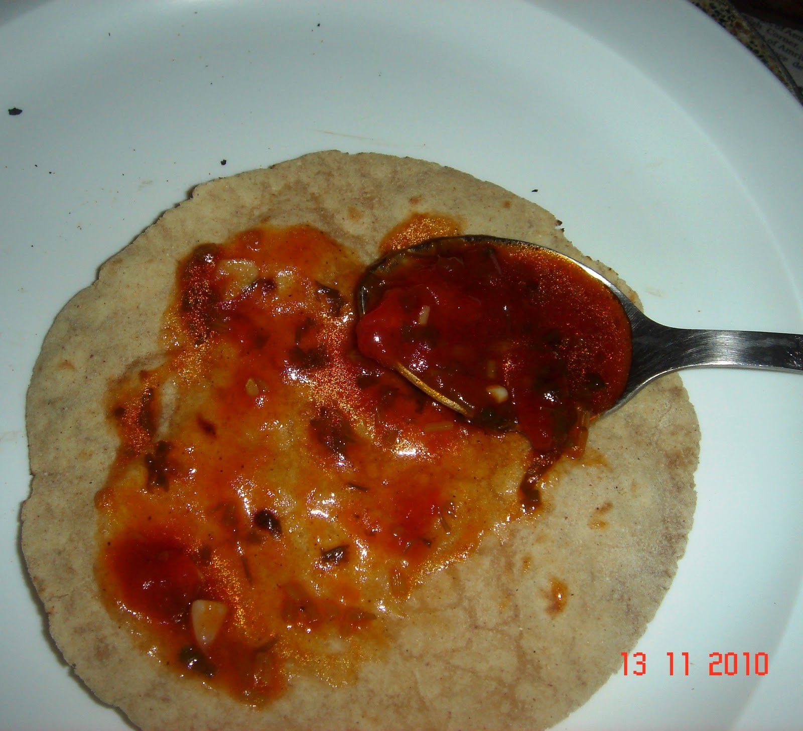 Now spread liberal coat of the Arrabbiata Sauce on the phulka.