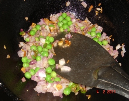 In a kadai heat the butter and let the fennel seeds splutter. Stir in the garlic pieces & the green chillis . Let them sizzle for a while before adding onions. Add green peas to the translucent mix and cook for a while. Now add the taste maker and salt.