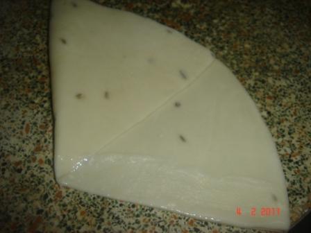 Take a half and fold one side in to a triangle ; brush the seam of the unfolded part with the flour paste (or water).