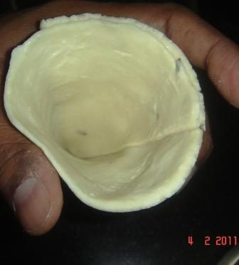 Take a medium sized ball and spread it flatly in to thin disc.Cut them into half !