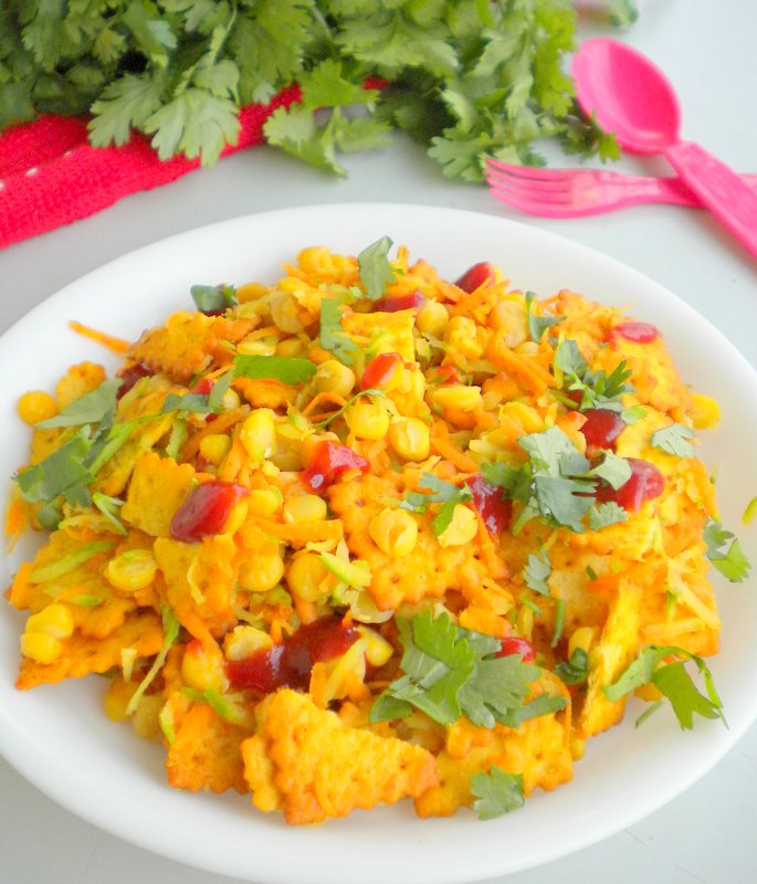 Crush ½ pack of Snackuits and mix in the rest of the pack in a bowl. Add chopped onion, carrots, chick peas, sweet corn, raw mango and toss well. Arrange on a plate. Mix together tomato sauce and red chilli powder. Drop big dollops over the chaat and garnish with coriander and enjoy.