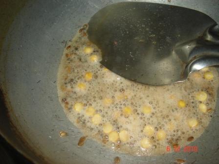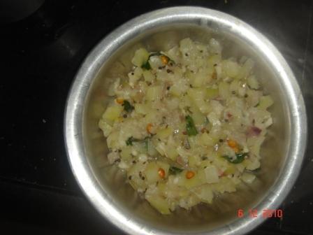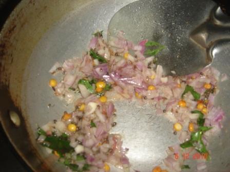 In the same pan add some oil and when its hot add mustard seeds, cumin seeds, chana and urad dal. when they turn brown add curry leaves and finely chopped onions and green chillies.