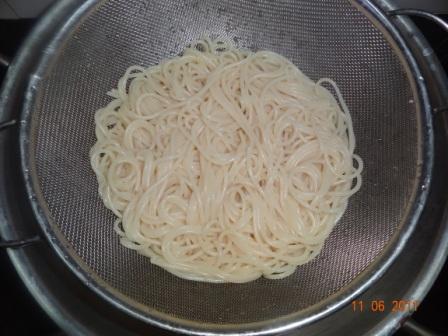 Cook the spaghetti as per instructions on the box and set aside.