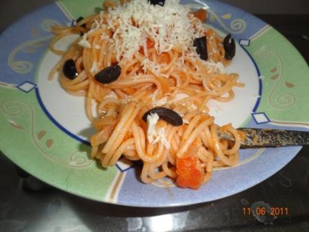 Just before serving, gently heat up the medici sauce and toss the cooked spaghetti in it (use sauce as required) . Serve hot garnished with cheese & black olives !