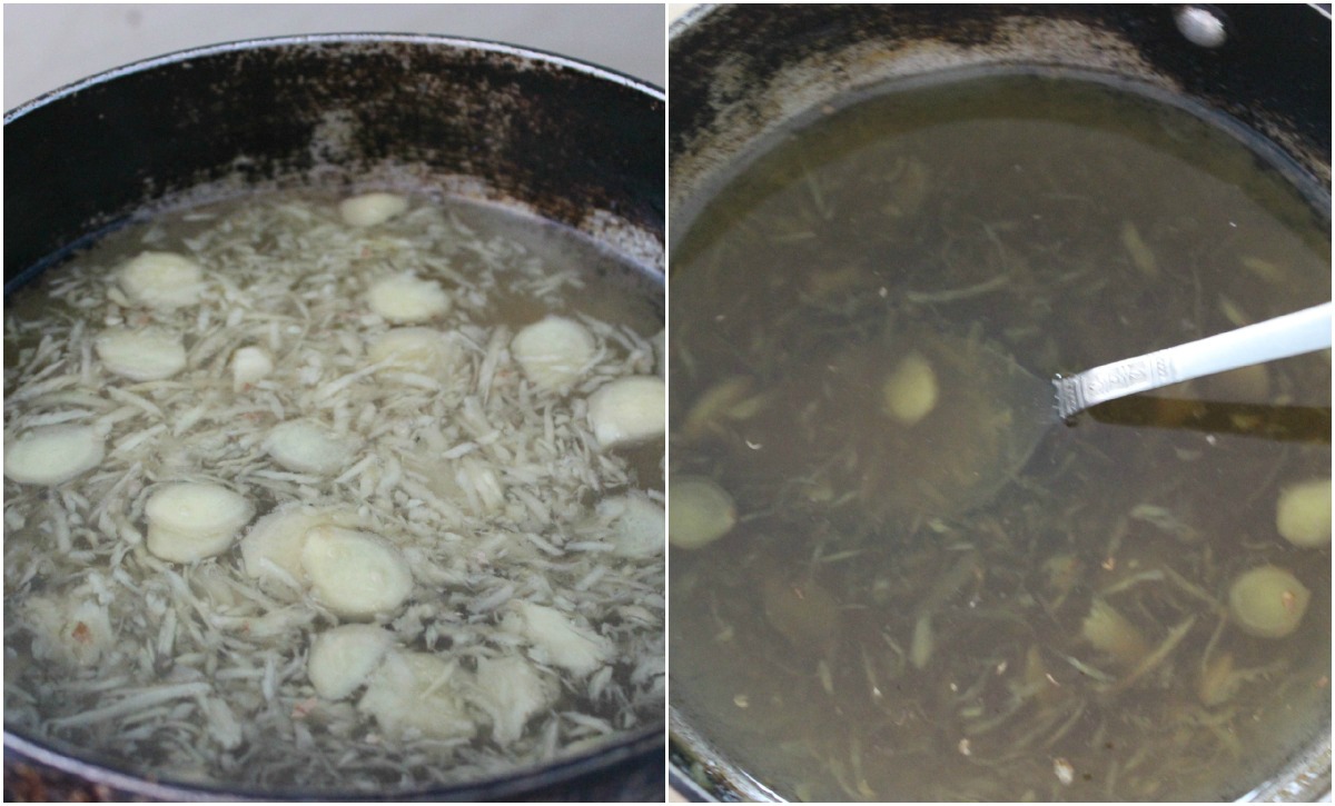Mix the water and sugar and bring it to a boil. Let it simmer till the sugar dissolves completely. Now tip in the ginger and let the whole mix stew on a low flame for 15-20 minutes.