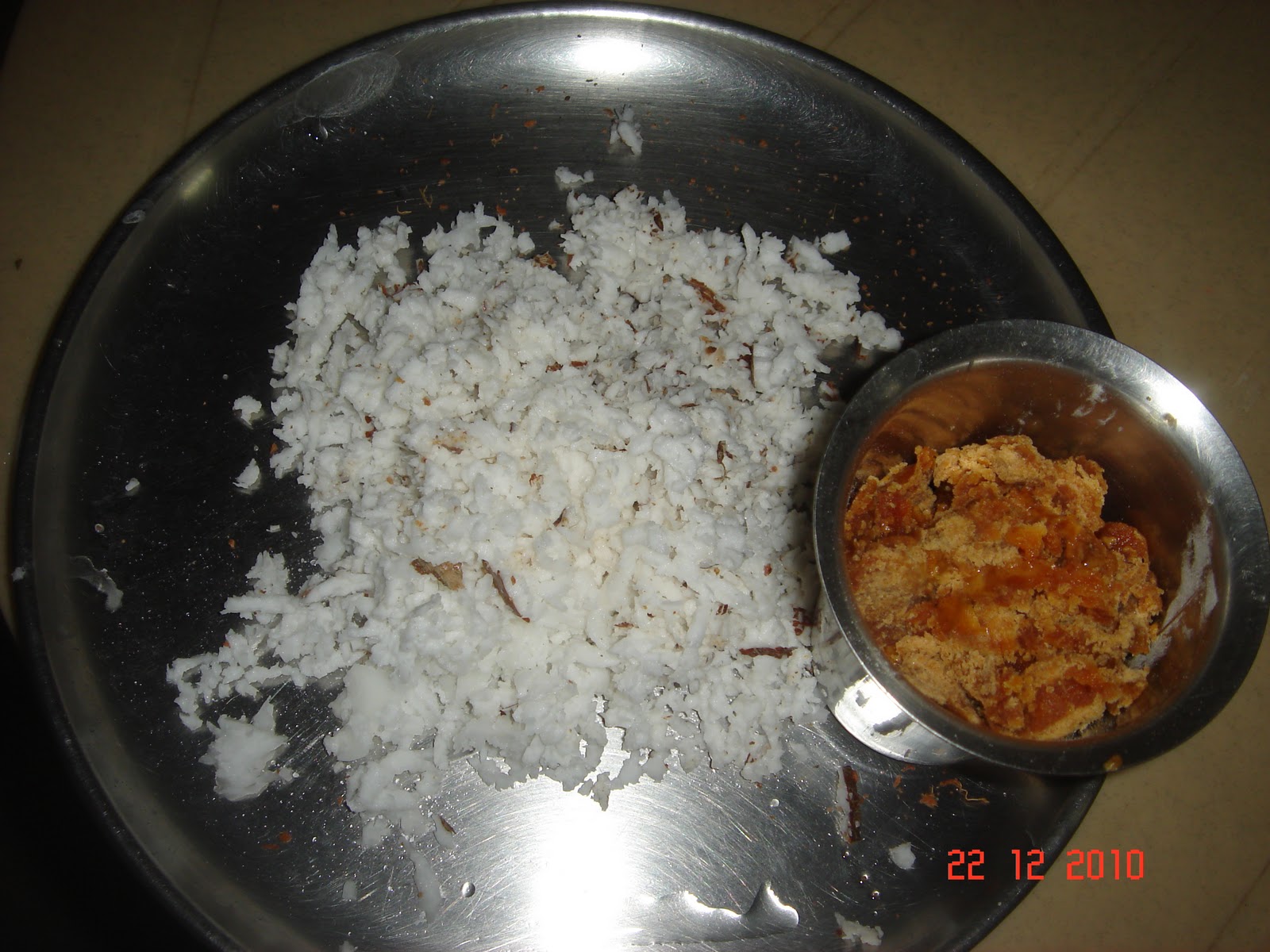 Now add the jaggery and let it melt. Add Elaichi to it and the grated coconuts and give it a swirl.