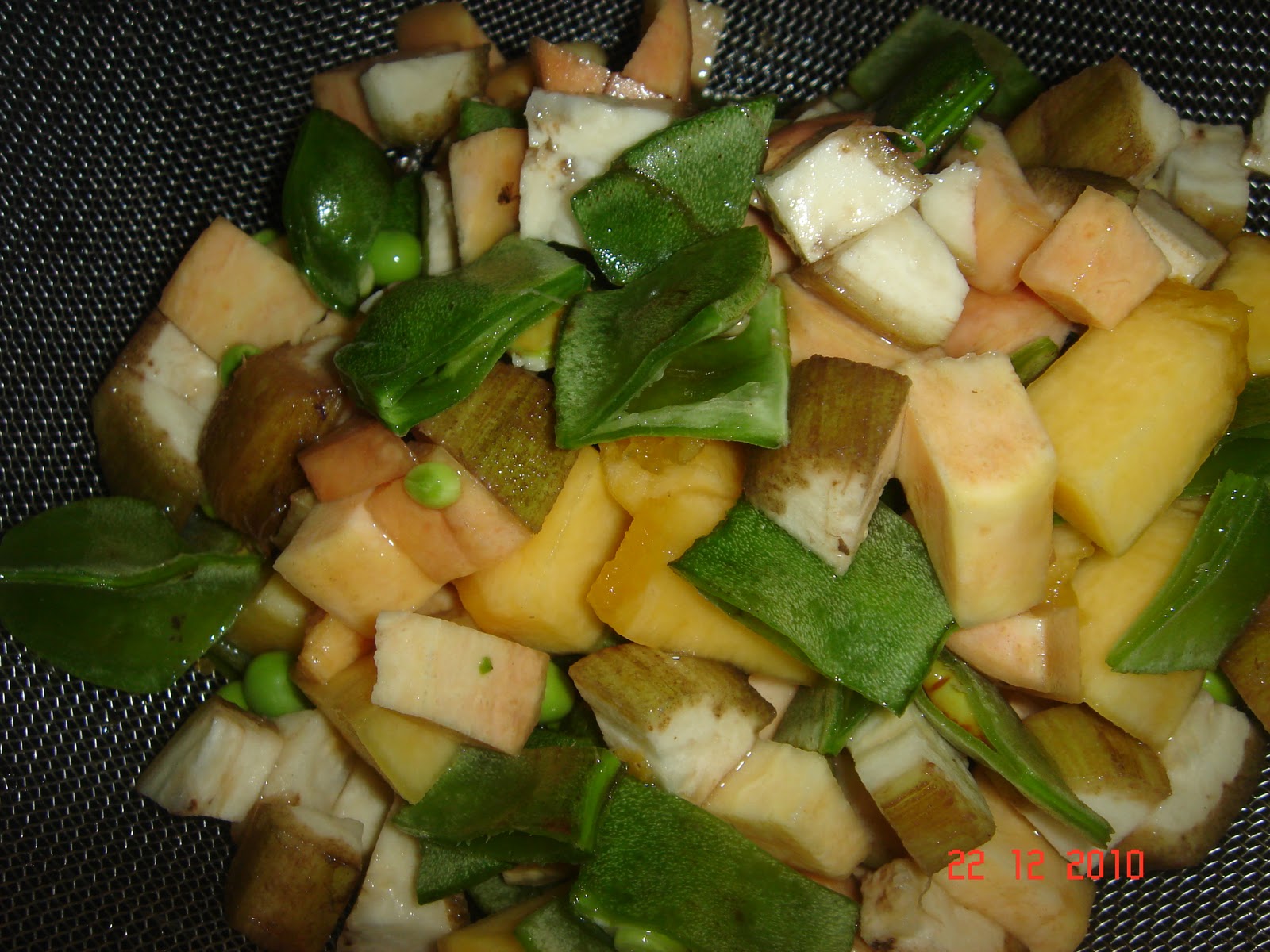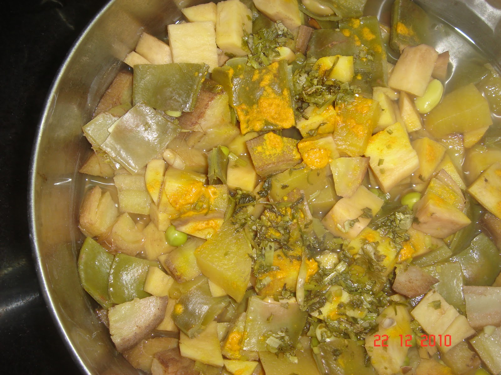 The kootu is generally either a 5 vegetable or 7 vegetable preparation. The vegetables are mostly root/tubers. The veggies/roots that can be used are Broad beans, Green peas, Raw Plantains, Sweet Potatoes,Elephant Yam,Yuca Roots etc…