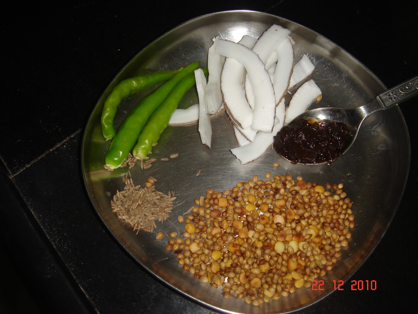 Dry roast coriander seeds and chana dal till they are crisp and grind it with the other ingredients of the spicy paste finely. Use water as required for the same.